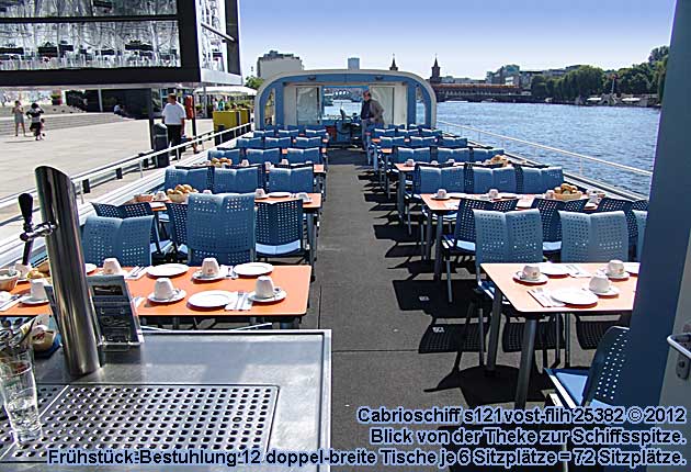 27,31 m lang, 5,08 m breit. Gesamtzulassung 100 Personen, barrierefrei. Bei Sightseeing-Touren stehen alle Stühle in Fahrtrichtung und es ist jeweils ein 35 cm schmaler Tisch vor dem nächsten = bis 96 Personen. Bei Buffet ohne Tanzfläche 10 variable Tische je 6 Stühle = bis 60 Personen. Bei Buffet mit Tanzfläche 8 variable Tische je 6 Stühle = bis 48 Personen. Party mit 4 normalen Tischen mit je 6 Sitzplätzen (24 insgesamt) und 4 Stehtischen bis 80 Personen. Spree-Cabrioschiff s136brbe-flih: