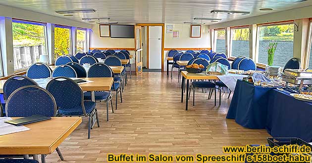 . Salonschiff für Events auf Havel und Spree empfohlen bis 90 Personen Spreeschiff s158boet-habu Gesamtzulassung: 144 Fahrgäste. Im Salon finden bis zu 60 Fahrgäste an Tischen Platz. Das Freideck / Sonnendeck ist voll bestuhlt und bietet mit 60 Sitzplätzen im Sommer die Möglichkeit, die Schifffahrt an der frischen Luft zu genießen. Einige Stehplätze im Bug. Empfohlen für Gruppen bis 60 Personen im überdachten Salon. Bei einer Personenzahl bis 45 wird das Buffet im Salon aufgebaut. Bei einer Personenzahl bis 60 wird das Buffet in der Schiffsspitze aufgebaut, sodass im Salon 60 Sitzplätze zur Verfügung stehen. Empfohlen für Gruppen von 70 bis 90 Personen, wenn auch das Freideck genutzt wird. Das Spreeschiff verfügt über eine Bordbar, an der die Crew Ihre Gäste mit einem reichhaltigen Getränkeangebot und Bier vom Fass und Cocktails versorgt. Der große Salon kann variabel bestuhlt und individuell für Ihr Event gestaltet werden. Im Sommer kann ein Grill inkl. Grillmeister für ein leckeres BBQ auf der Spree gebucht werden. Eigenes Grillen NICHT möglich. Ob Firmenfeier, Sommerfest, Incentive, Betriebsfeier, Teamevent, Geburtstag oder Hochzeit – das moderne Eventschiff bietet für Events jeglicher Art die richtige Location in Berlin. Dieses Havel- und Spreeschiff ist beheizt und fährt auch im Winter (solange eisfrei).